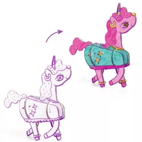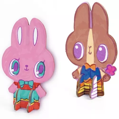 Het knutselpakket bestaat uit stevige kartonnen vormpjes die in elkaar geschoven kunnen worden tot een 3D speelfiguur. Maar voor het zover is krijgen de vertederende dieren graag een kleurtje!