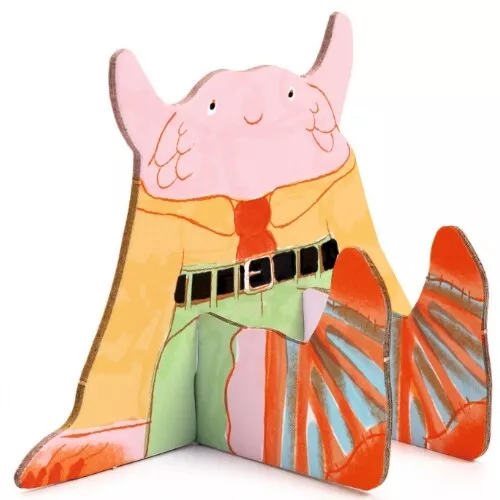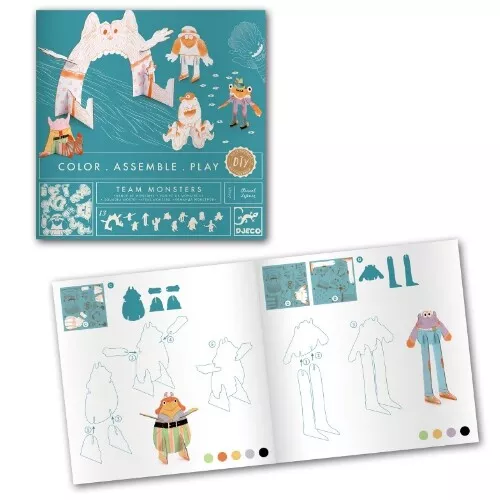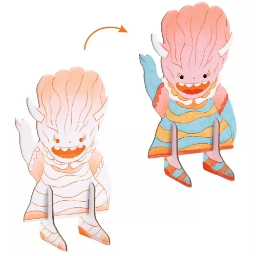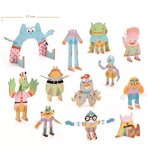 Het knutselpakket bestaat uit stevige kartonnen vormpjes die in elkaar geschoven kunnen worden tot een 3D speelfiguur. Maar voor het zover is krijgen de fantasierijke monsters graag een kleurtje!