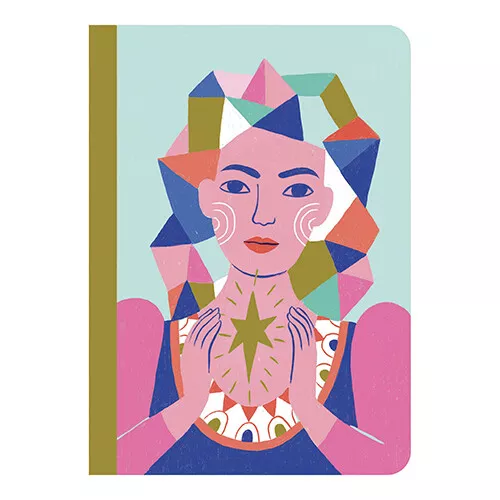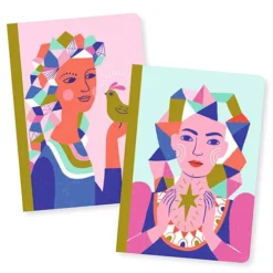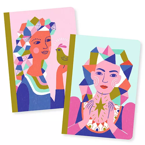 Twee handzame A6 notitieboekjes ‘Sarah Little Notebooks’ uit de lijn Lovely Paper van het Franse merk Djeco met op de voorkant kleurrijke illustraties van een vrouw met een vogel of ster met metallic details. EÊn notebook heeft blanco papier en het andere boekje is gelinieerd, met op elke pagina een klein tekeningetje.