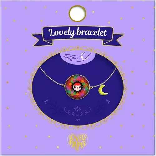 Een kinderarmbandje ‘Sunshine’ van het Franse merk Djeco. Dit sierlijke armbandje met een gouden, metalen kettinkje heeft twee bedeltjes: een stralend gezichtje en een maantje.