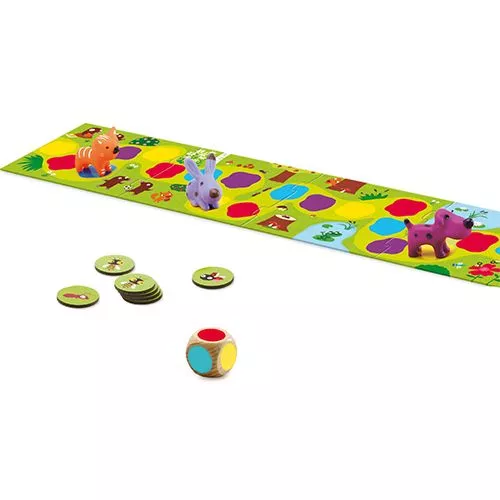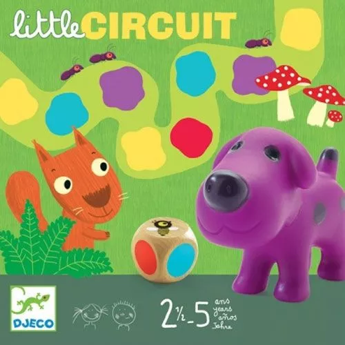 Little Circuit van Djeco is een gezellig spel, ook voor kleine kinderen. Een super leuk parcourspel om te spelen met het hele gezin. Puzzel eerst de weg uit en dan spelen maar! Er lopen kleine dieren over de weg. Met de dobbelsteen wordt ‘rood’ gegooid! Het hondje mag tot het volgende rode vakje doorlopen.