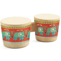 Een dubbele houten trommel van het Franse merk Djeco. Een vrolijke muziekinstrument versierd met kleurrijke olifanten voor de groeiende muzikant! De twee trommels zitten aan elkaar bevestigd.