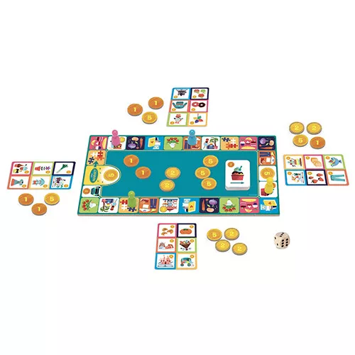 Om het kinderspel ‘P’tit Market’ van het Franse merk Djeco te winnen hebben kinderen een beetje geluk nodig, maar dienen ze vooral slim om te gaan met geld. Wie heeft als eerste alle boodschappen van het lijstje verzameld?