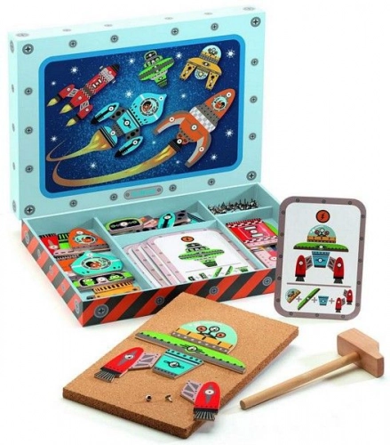 Een fantastische spaceset voor de jonge designer en knutselaar van het Franse merk Djeco. Bouw met het spel hamertje tik de coolste ruimteschepen met nageltjes op een kurkbord.