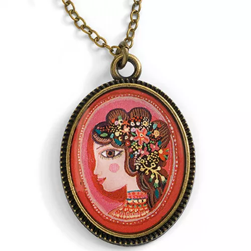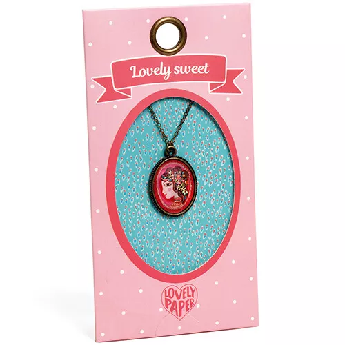 Een elegante, metalen kinderketting ‘Divine’ met hanger uit de collectie Lovely Sweet van het Franse merk Djeco. Op het medaillon een meisje en profiel met schitterend versierd en opgestoken haar tegen een donkerroze achtergrond.