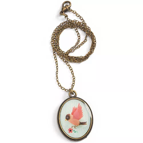 Een elegante, metalen kinderketting ‘Oiseau’ met hanger uit de collectie Lovely Sweet van het Franse merk Djeco. Op het medaillon een vogeltje met roze vleugels dat een bloem lijkt los te laten tegen een blauw-wit gestreepte achtergrond.