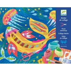 Met dit knutselpakket ‘Paste Workshop’ van het Franse merk Djeco maken kinderen door middel van sjablonen, ponstangen en gemêleerd papier de mooiste collages. Door te knippen, te ponsen en te plakken ontstaan uit verschillende vormen unieke vissen en andere zeedieren.