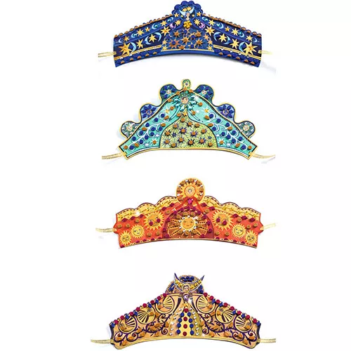 Kleine prinsessen maken sprookjesachtige kroontjes met de knutselset ‘DIY 4 Mosaics Tiaras To Decorate’ van het Franse merk Djeco.