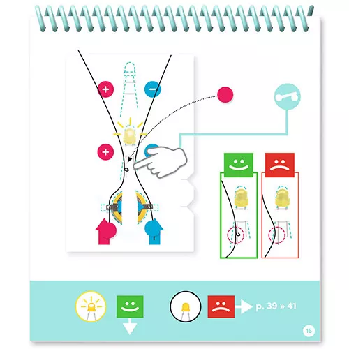 De jonge kunstenares maakt een elektrisch schakeling met behulp van geleidende draad. Vervolgens kunnen versieringen toegevoegd worden en het speldje.