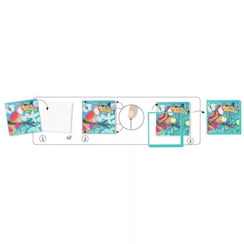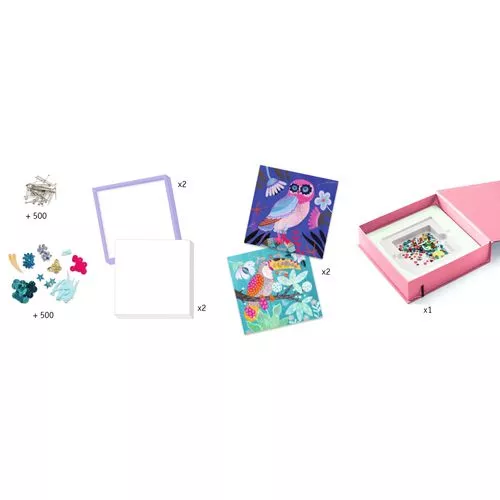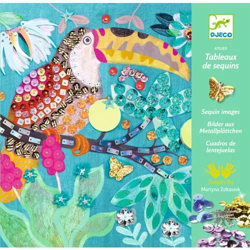 Een exotische knutselset met lovertjes uit het ‘Atelier Tableaux de sequins – Flamboyants’ van het Franse merk Djeco. Maak de poëtische schilderijen compleet door de gekleurde lovers met kleine naaldjes in de gekleurde plaat te prikken. Voorzie de vogels van een prachtige dos veren.