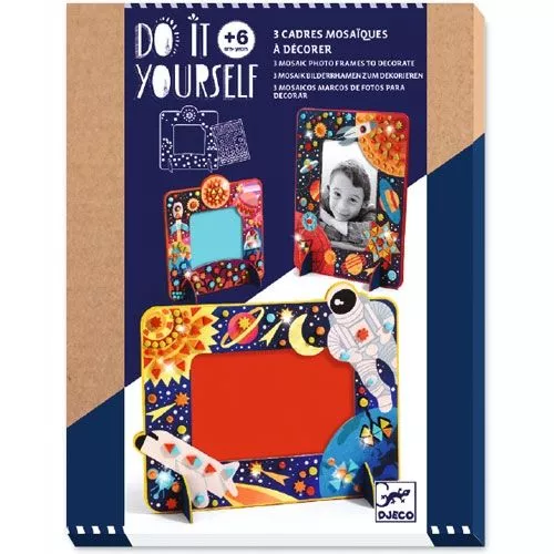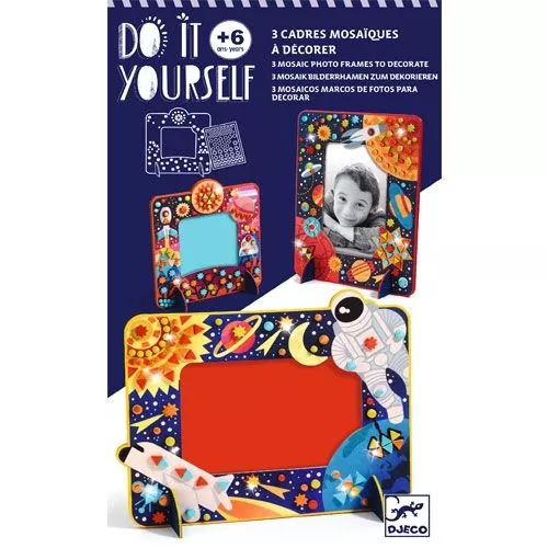 ‘DIY Mosaics Frames – In Space’ van het Franse merk Djeco is een knutselset om jonge kinderen kennis te laten maken met mozaïek, op basis van zelfklevende onderdelen. Spelen met vormen, materialen en kleuren om drie geweldige fotolijsten te maken.