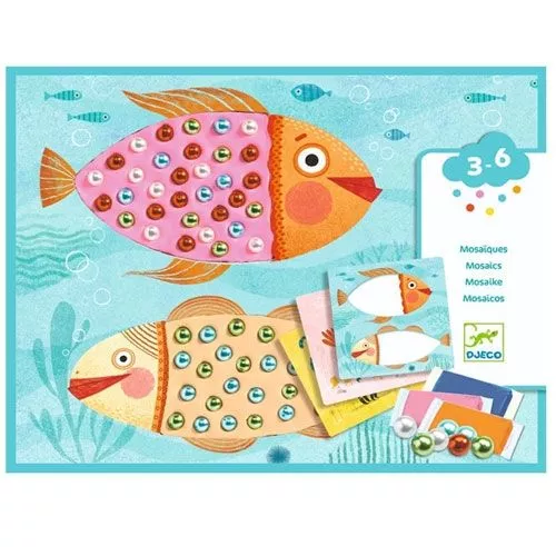 Eerst een beetje lekker kleien en dan prachtige parels aanbrengen op de kartonnen tegels van deze knutselset ‘Mosaïque de perles’ van het Franse merk Djeco.