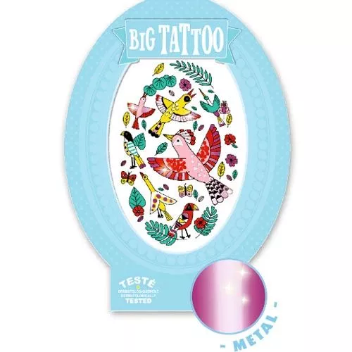 Grote, exotische ‘Big tattoo Birdy’ met vogels van het merk Djeco. Een kindertattoo boordevol metallic details.