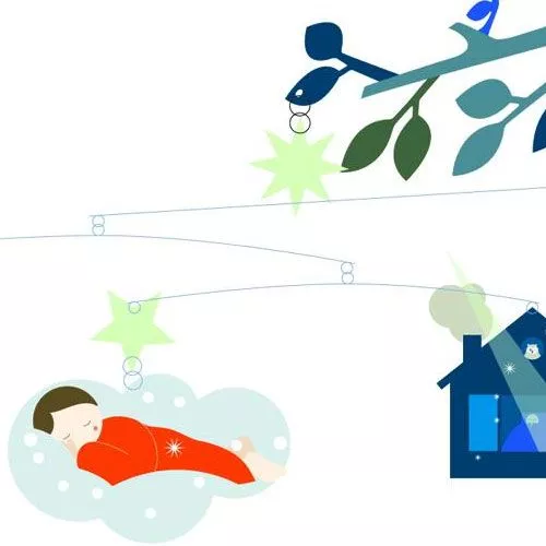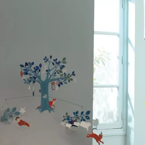 De mobiel bestaat uit zo’n 20 bijzonder geïllustreerde hangers. Een groene boom met verschillende hangers hangen vrolijk in de lucht.