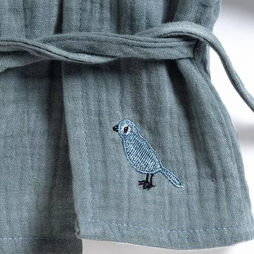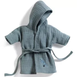 Een behaaglijke poppenbadjas voor Pomea babypoppen van het Franse merk Djeco. De badjas van mousseline katoen heeft een geborduurd vogeltje aan de voorkant.