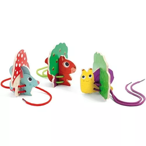 De peuterset bestaat uit zes houten rijgkaarten met afbeeldingen van vrolijke dieren en hun favoriete lekkernij. Rijg het dier aan de juiste lekkernij met de drie gekleurde rijgveters.