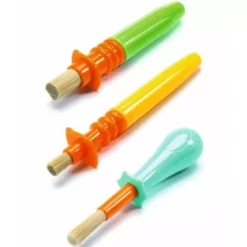 Drie stevige kinderkwasten van het Franse merk Djeco met anti knoeirand, waarmee de penselen veilig op tafel kunnen liggen. Dat maakt deze slimme kwasten zo geschikt om mee te lijmen en schilderen.