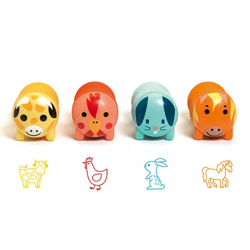 Een stempelset ‘Stamps for little ones – Farm animals’ van het Franse merk Djeco met vier ergonomische peuterstempels van boerderijdieren.