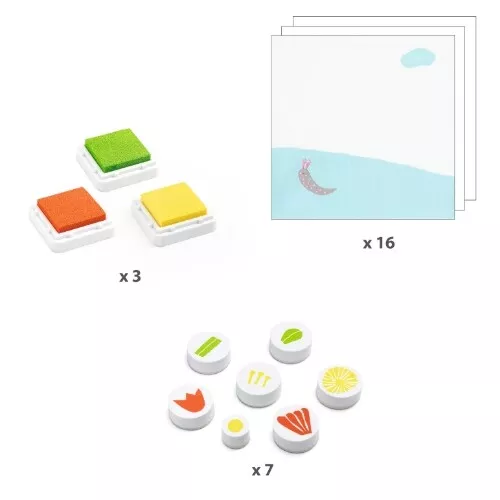 Een decoratieve stempelset ‘With Flowers’ van het Franse merk Djeco om mooie illustraties te maken.