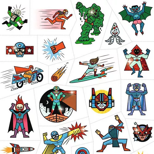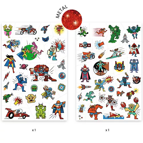 Gaan deze superhelden de schurken verslaan? Twee vellen met stoere kindertatoeages ‘Heroes Vs. Villains’ van het Franse merk Djeco om de huid mee te versieren. De plaktattoos van superhelden en schurken hebben rode glitters, zodat ze sprankelen in het licht.